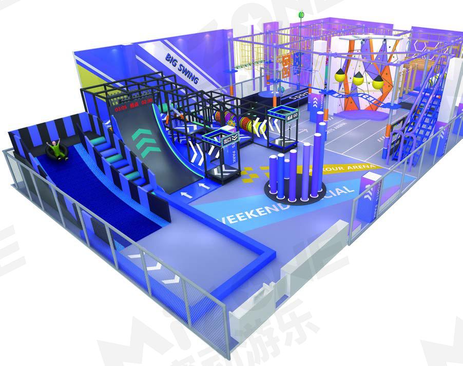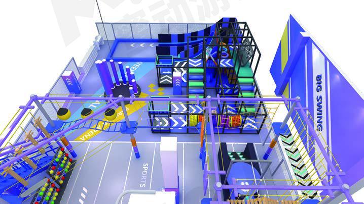 這座室內運動館以紫藍交融為特色,動感十足,宛如夢幻樂園。忍者拓展區(qū),紫底藍線,神秘又靈動;高空拓展區(qū),藍道紫韻,如云端漫步;滑草滑梯區(qū),藍河流淌,歡樂無限;抱石攀巖區(qū),紫墻藍星,力量與挑戰(zhàn);漸變梅花樁區(qū),紫藍漸變,如夢似幻??靵磉@里,感受紫藍色的魅力,盡享運動的樂趣!